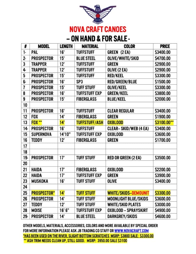 JB Trading Co is one of the largest stocking dealers of Nova Craft Canoes. We attempt to keep a good inventory of models and various materials of the best canoes on the market.
